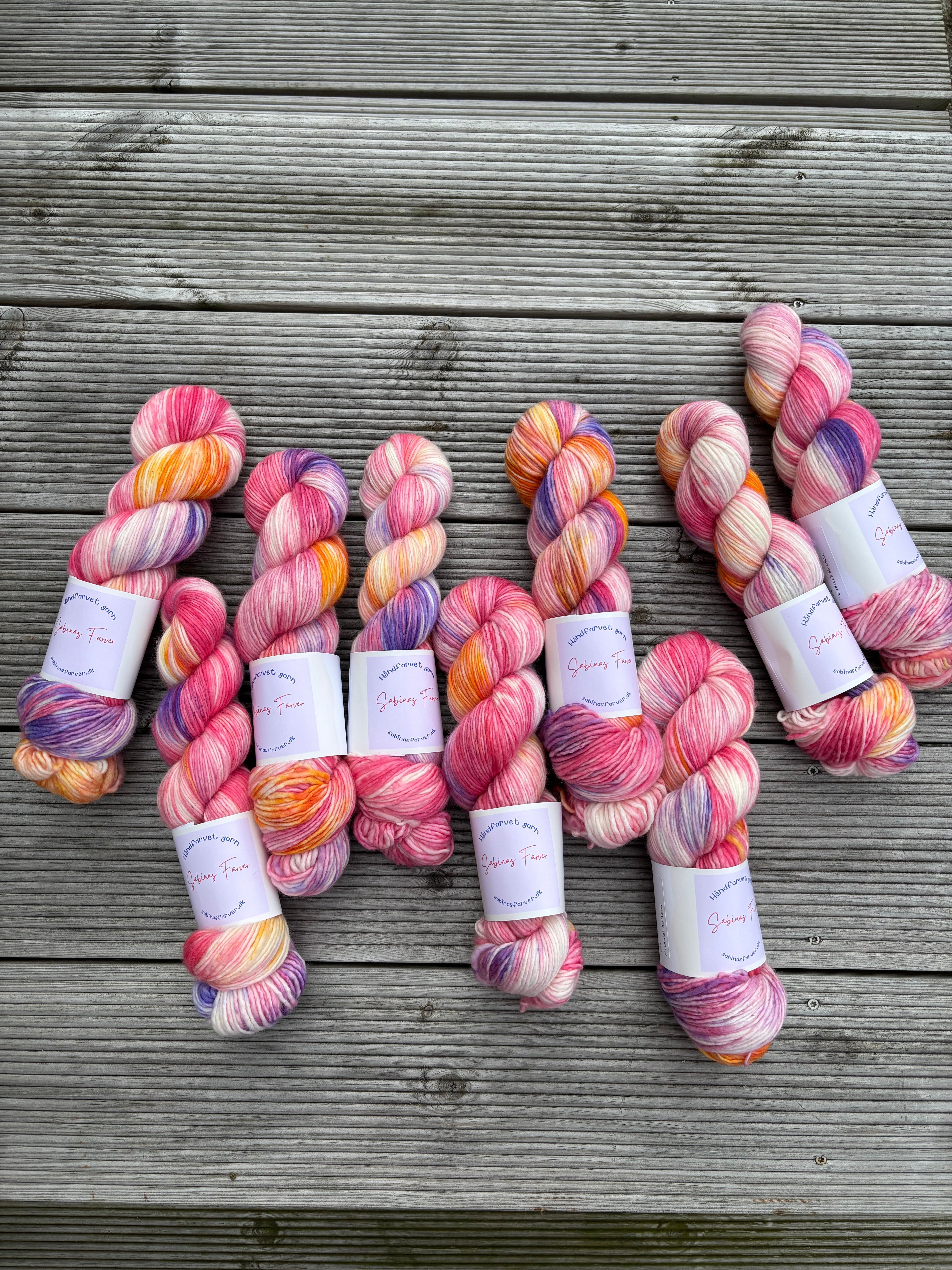 Når du køber håndfarvet garn støtter du typisk lokale, mindre virksomheder. Du køber ind på lige præcis dén garnfarvers stil og personlighed. Du ved at der er lagt tid, energi og håndværk i processen. Mine garnbaser er primært naturfibre i høj kvalitet, og de er nøje udvalgte ud fra hvad jeg selv elsker at strikke. Jeg laver ikke nye farver på bestilling, da det er vigtigt for mig at bevare min nysgerrighed og kreativitet. Det gør jeg kun ved at farve det der taler til mig. Og så håber jeg mit udvalg byder på lige det garn og de farver der også taler til dig.