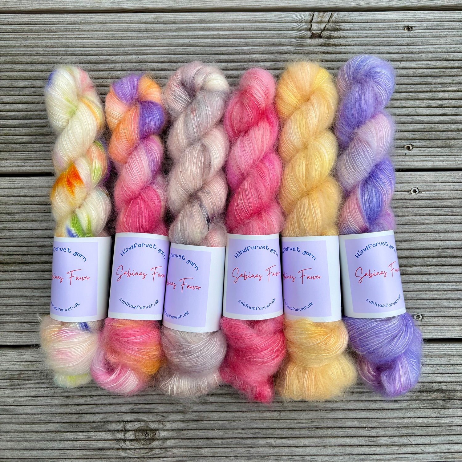 Sabinas Farver er et farveunivers af håndfarvet garn med plads til både det skøre og skæve, det elegante og det vilde - farvet på gode basisgarner i 100% merinould samt mere eksklusive baser med mohair, alpakka, silke og cashmere.